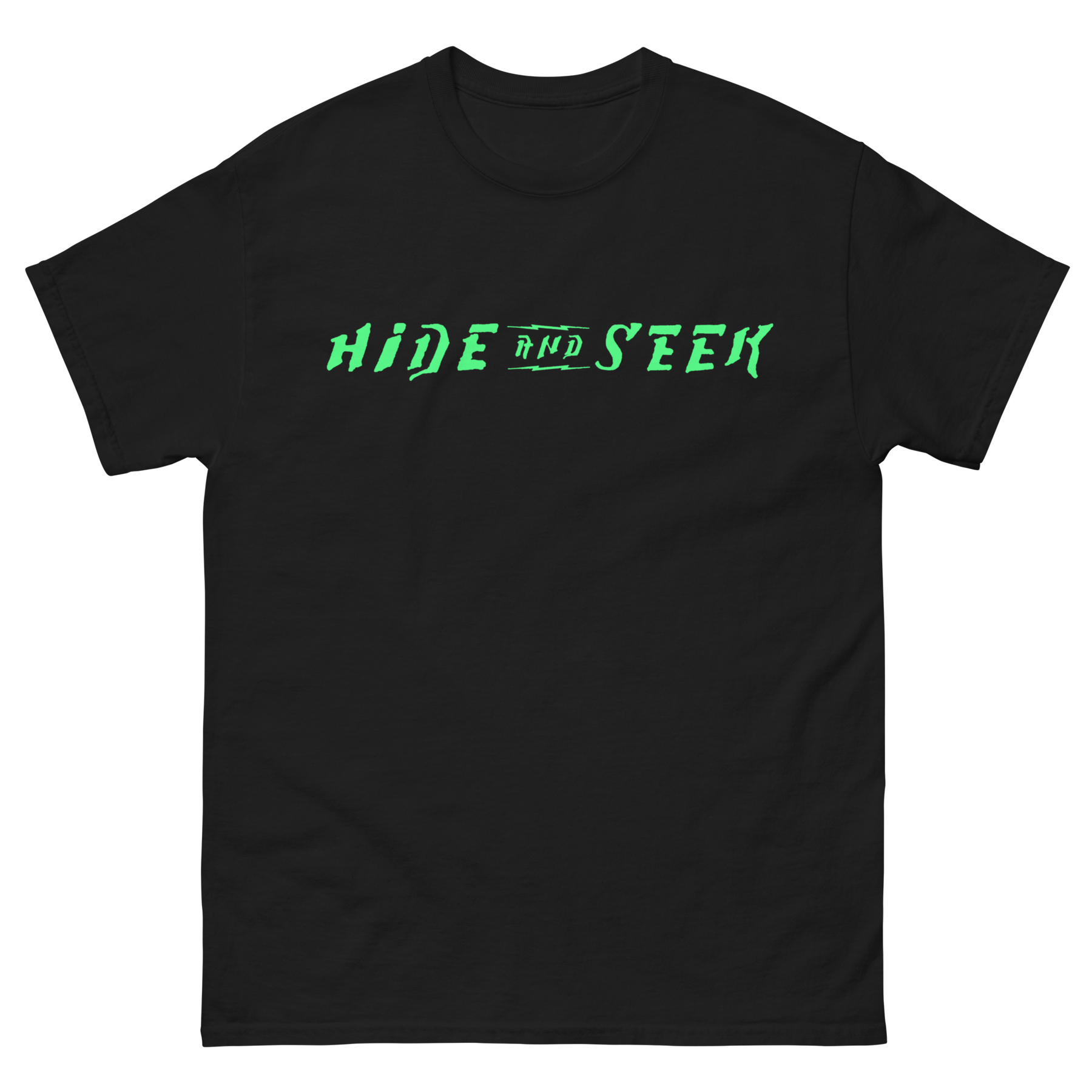 This tee features a Hide and Seek logo printed loud, direct, and impossible to ignore—just like the questions that keep us listening.