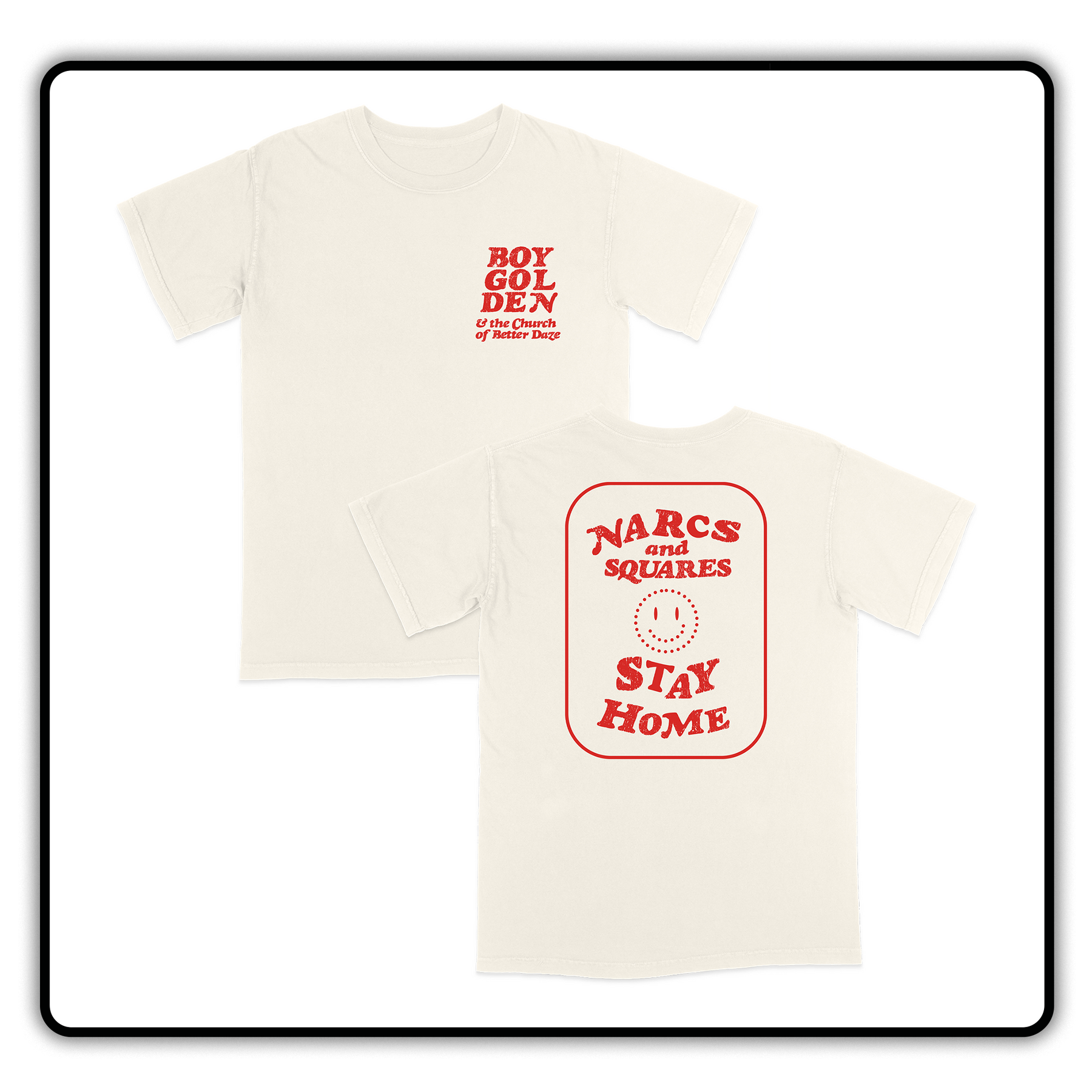 Narcs and Squares design printed on the front of a natural colored tee.