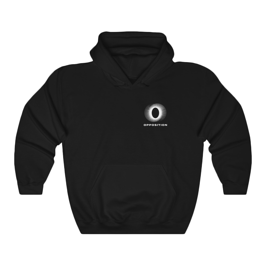 Opposition logo printed on the front pocket of a black hoodie.