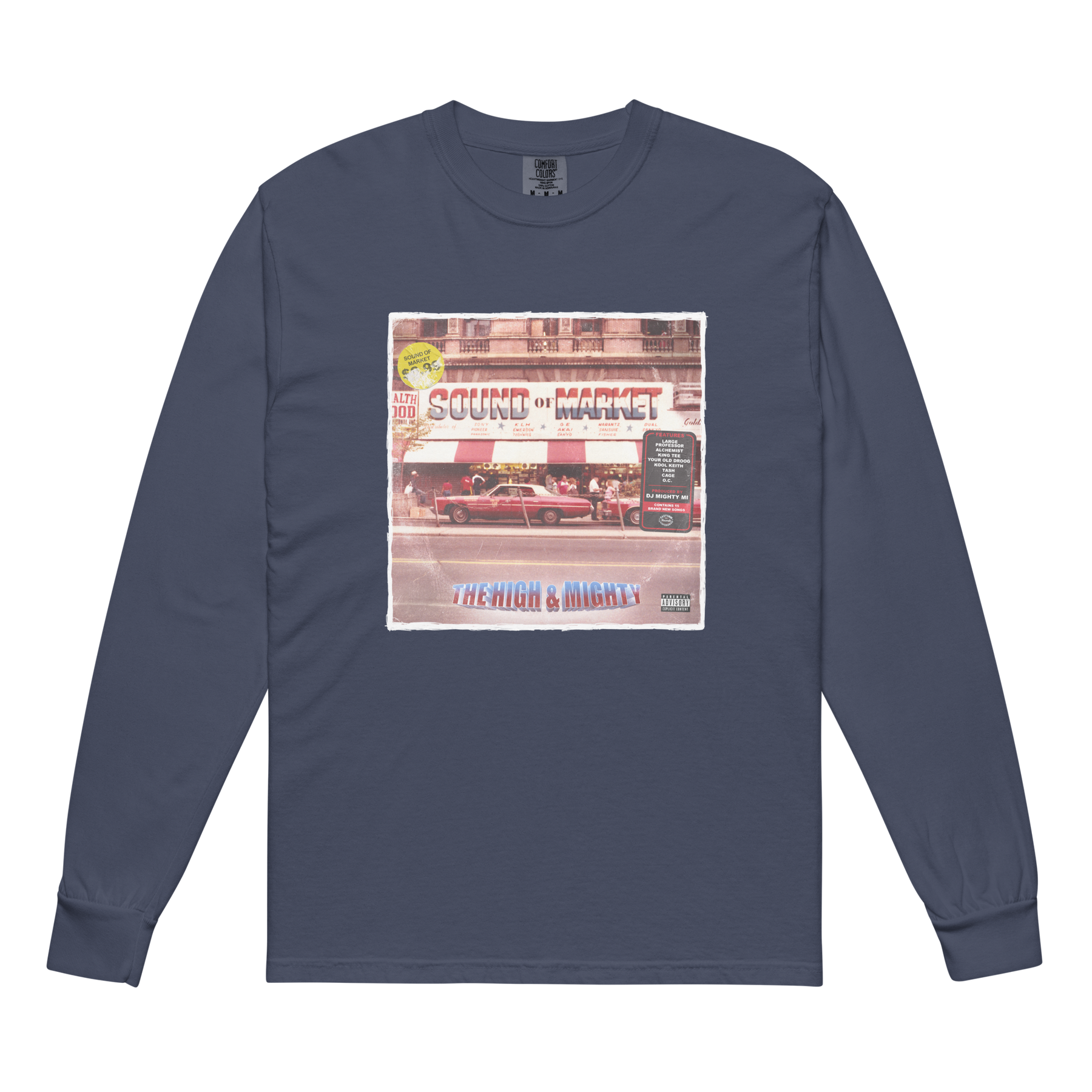Classic long sleeve tee featuring Sound of Market album artwork. Available in black, navy, and light green.