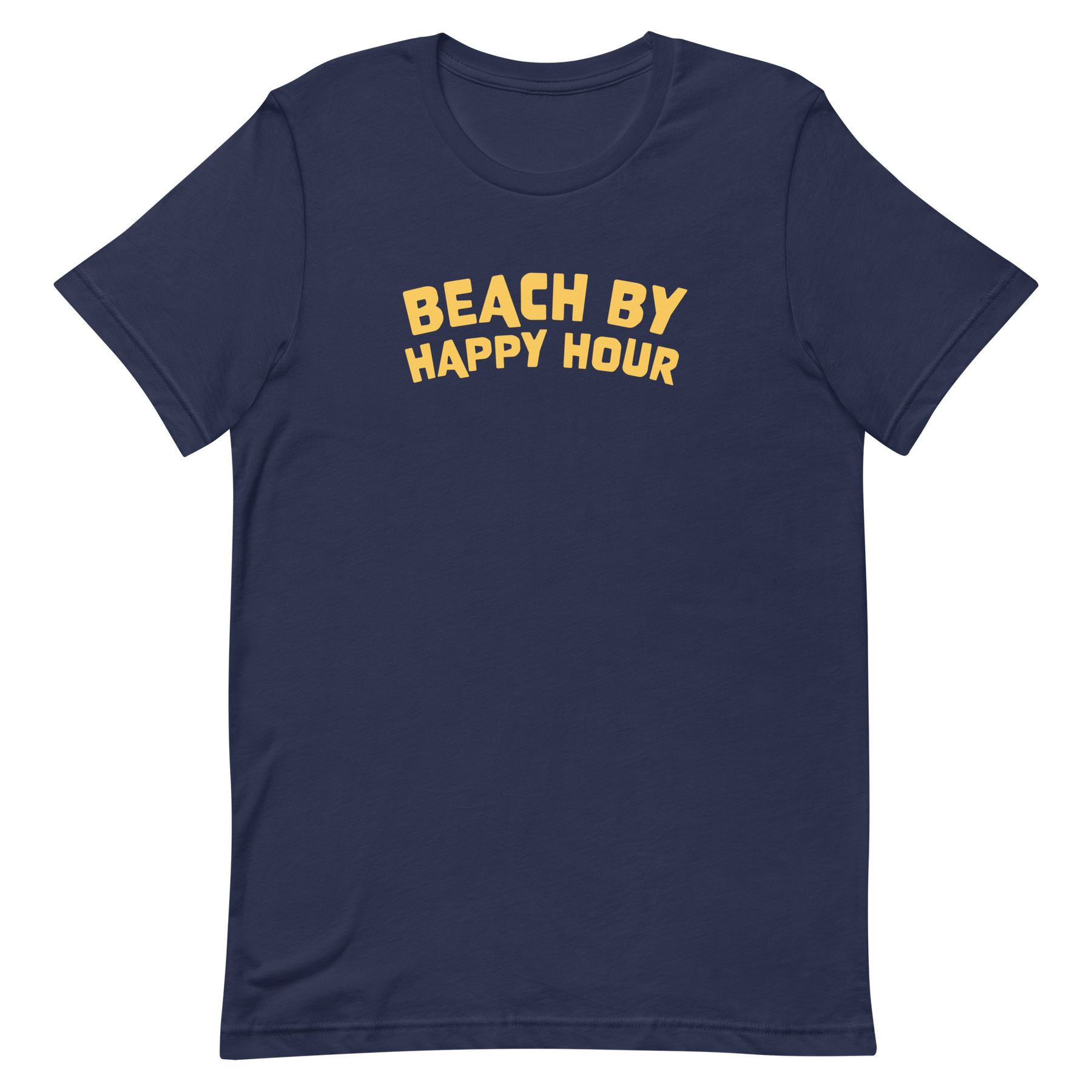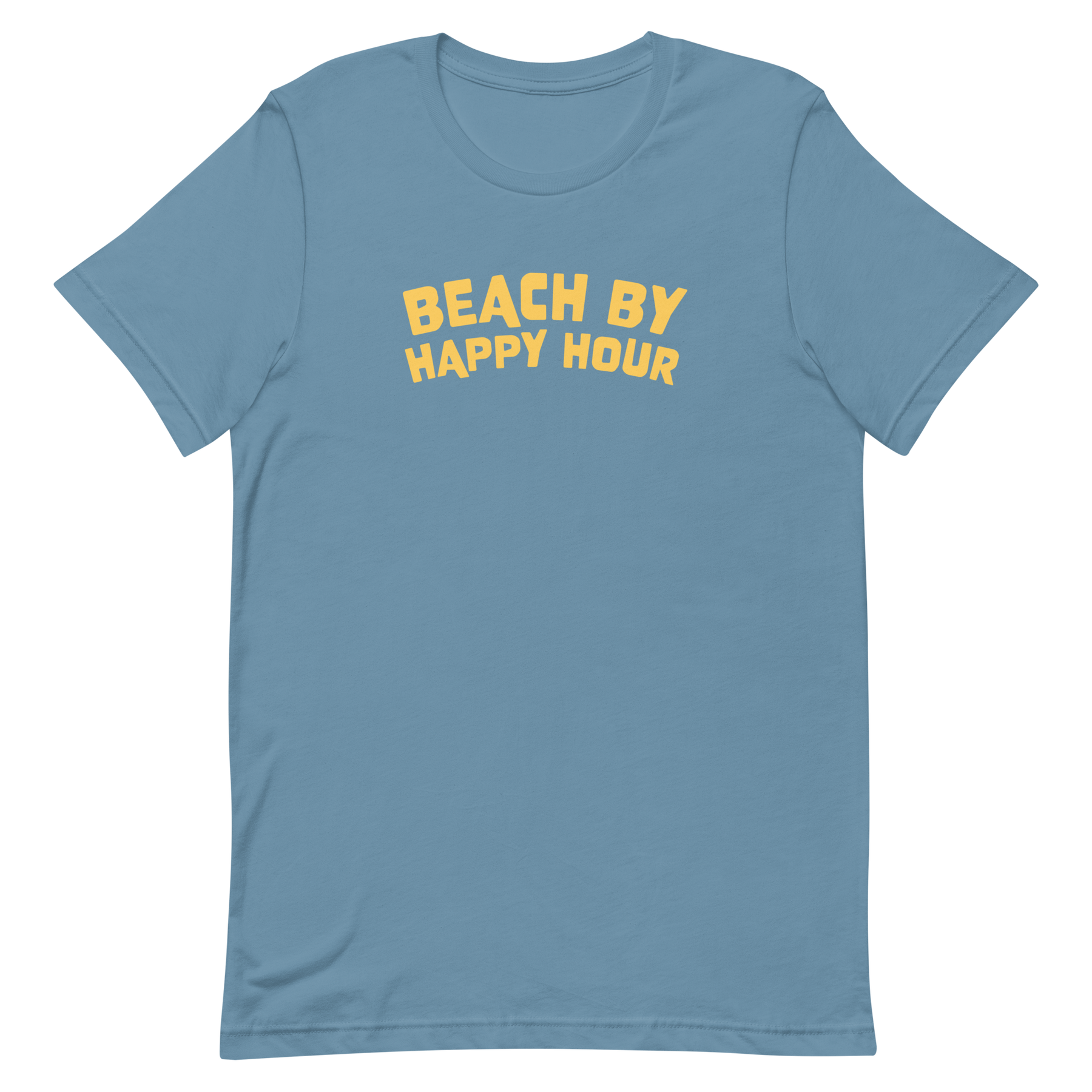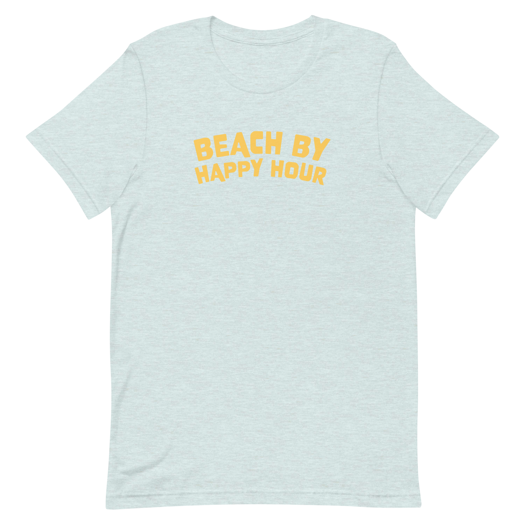 "Beach by Happy Hour" printed on a bella + canvas t-shirt. Available in multiple color options. Product Details: