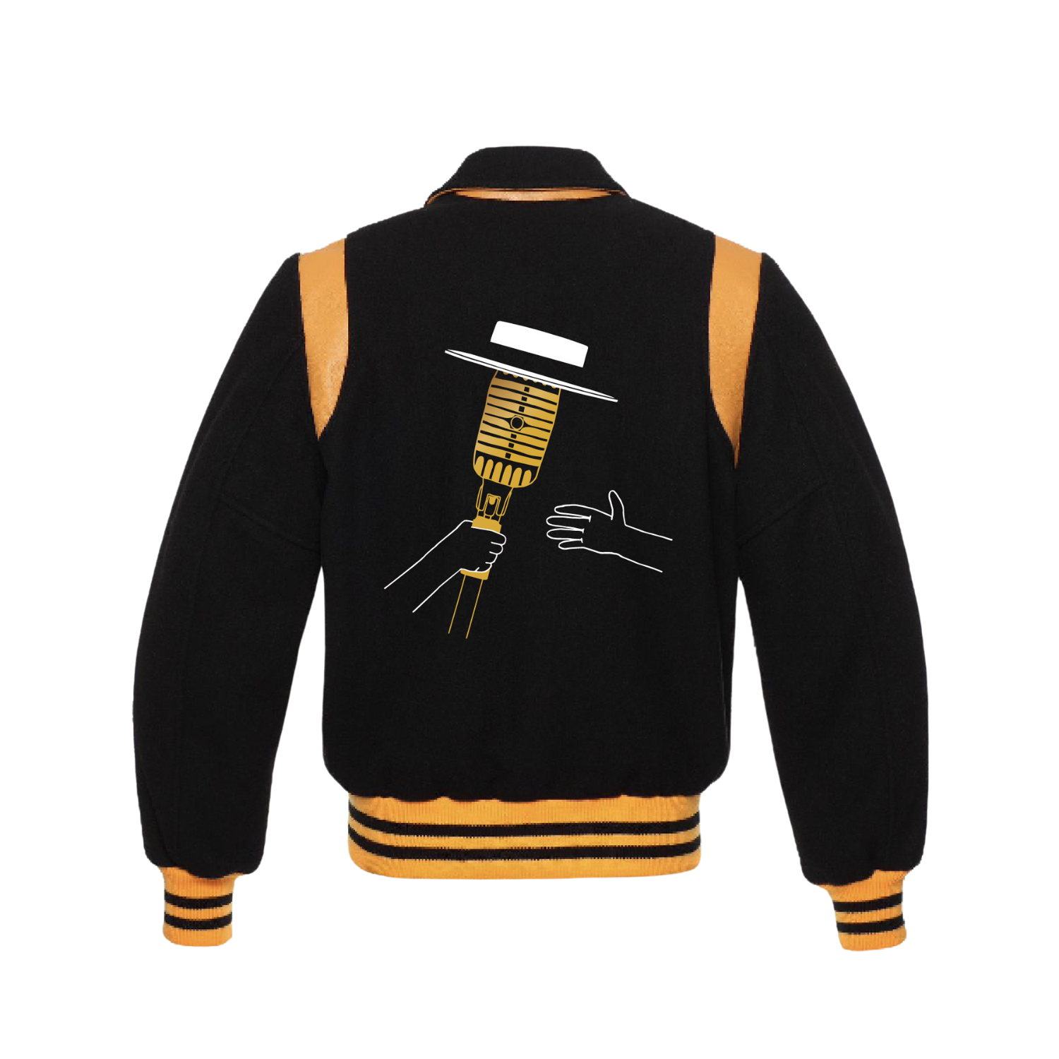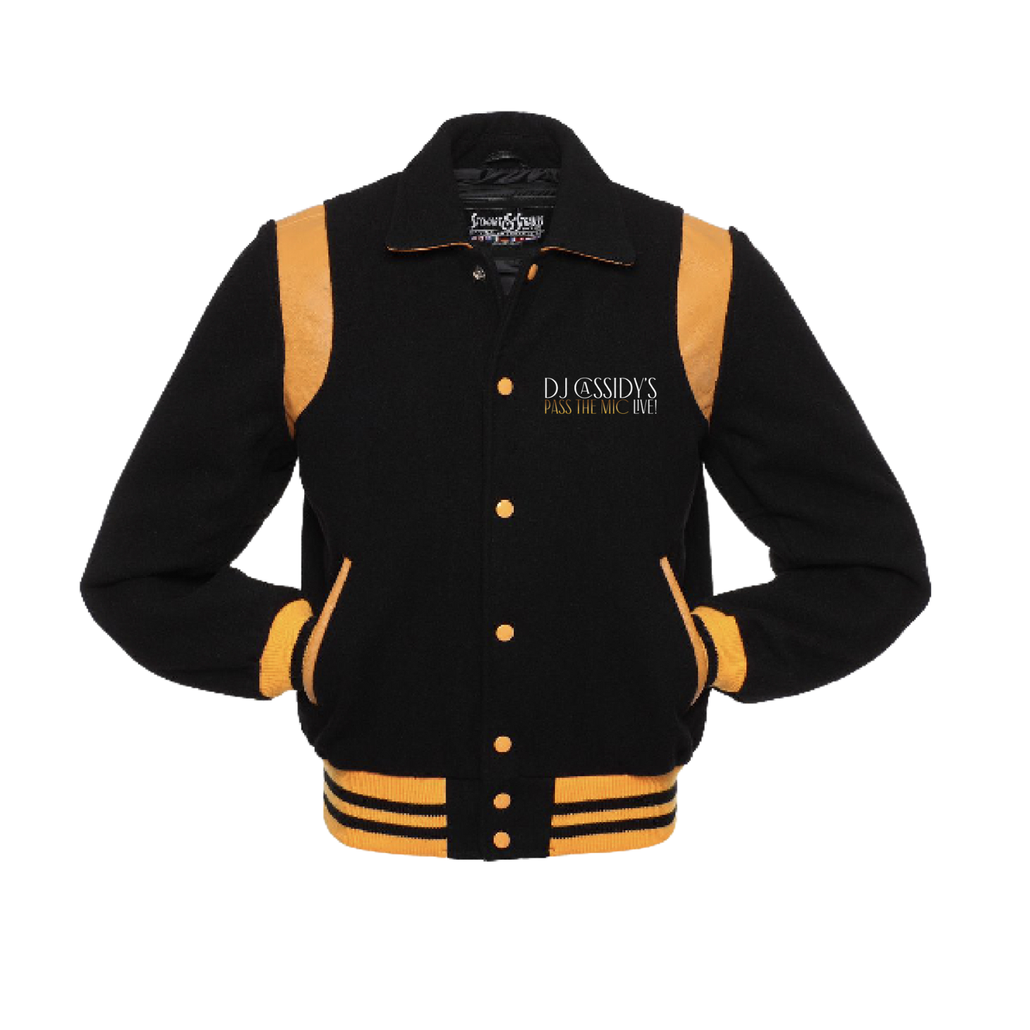 Limited Edition black wool varsity tour jacket featuring the Pass The Mic Live! verbiage logo on the front and the original Pass The Mic hands logo embroidery on the back.