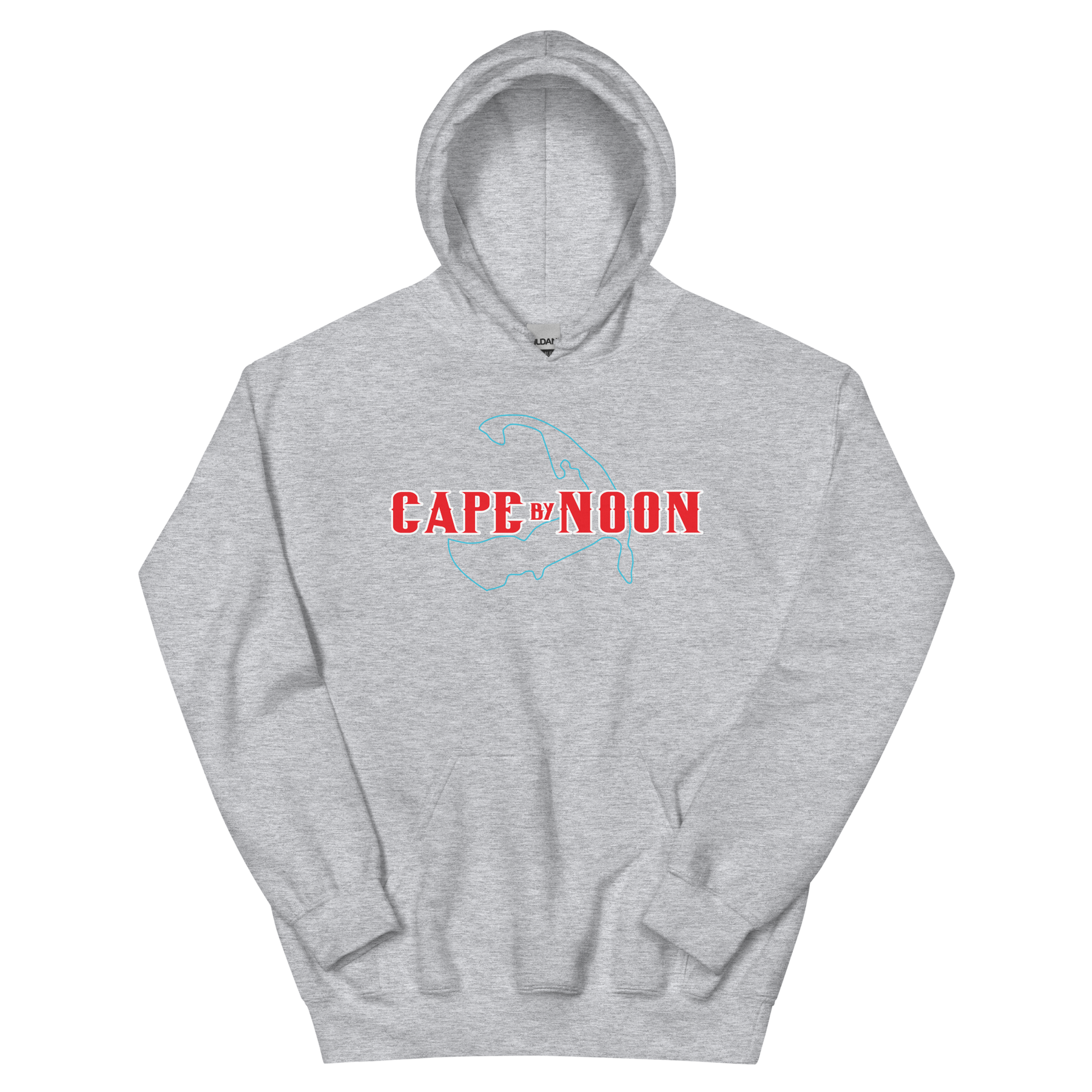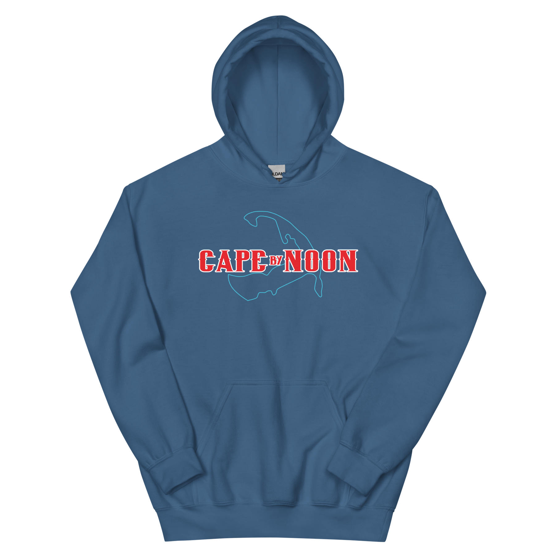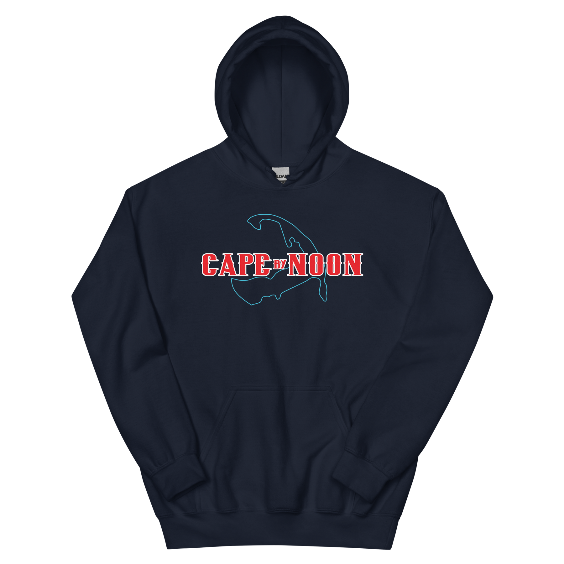 Outline of Cape Cod, with "Cape by Noon" printed above. Red, white, and blue design available in multiple color options. Product details: